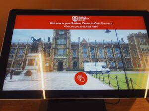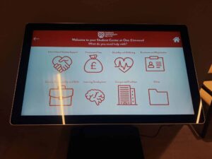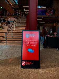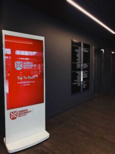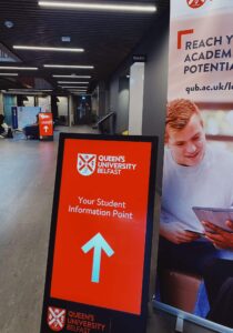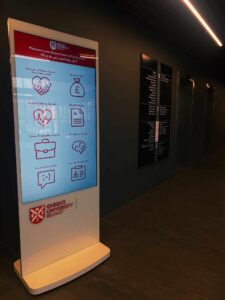 Queens SU designed a flexible social space as the heartbeat for campus life and as such need dynamic solution to provide access to key info on student facilities and important messaging. MAD deployed 4 x weatherproof battery powered portable A Boards, two vertical touch screens, and a horizontal touch screen with banded vinyl decals ensuring the digital signage fitted seamlessly into the vibrant student environment.